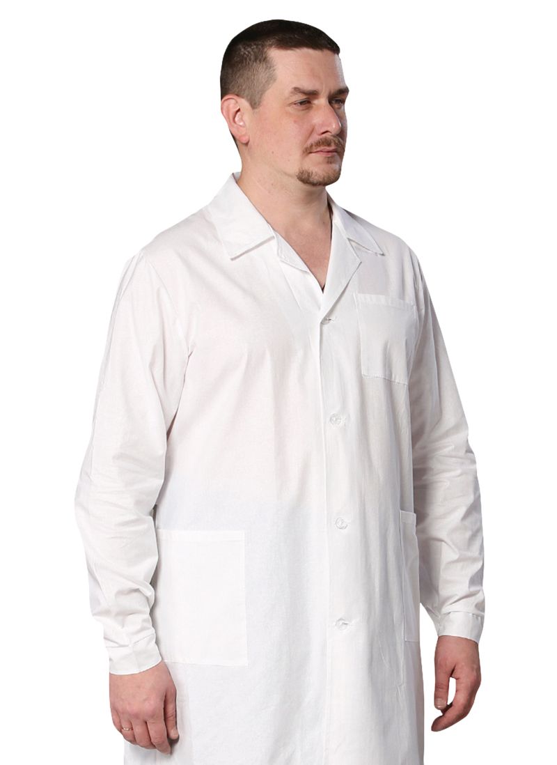 Халат с центральной бортовой застежкой на пуговицы. На женском халате предусмотрены нагрудные вытачки на полочках. Один нагрудным и два нижних накладных кармана.