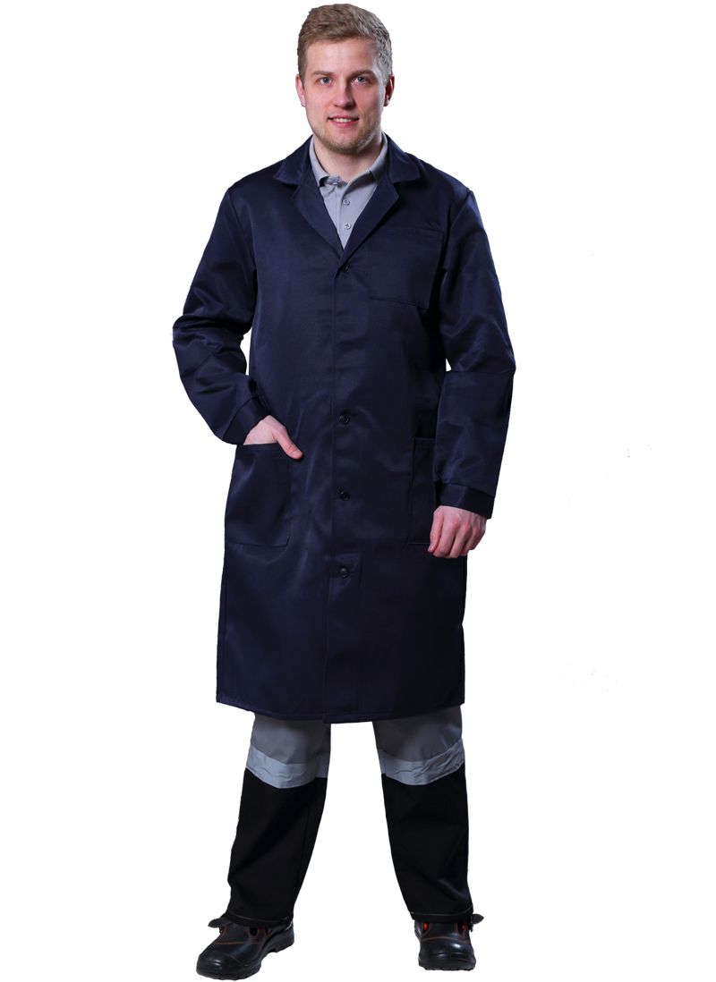 Халат с центральной бортовой застежкой на петли и пуговицы. Воротник отложной. Полочки с одним нагрудным и двумя нижними накладными карманами. Нижние карманы входят в боковые швы. Спинка со средним швом, с хлястиком, втаченым в боковые швы. Рукава с манжетами, застегивающимися на пуговицы.