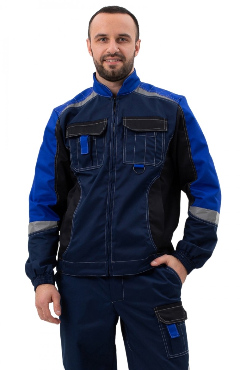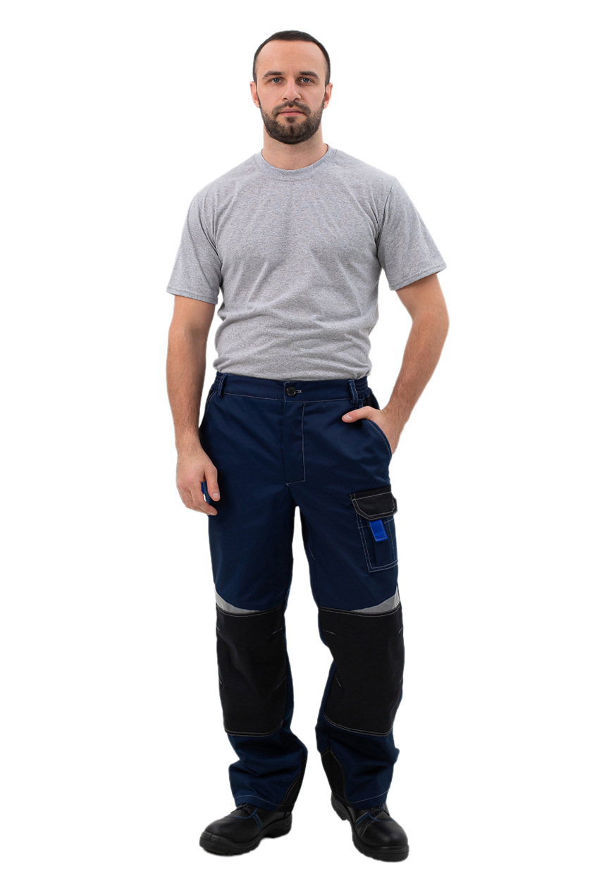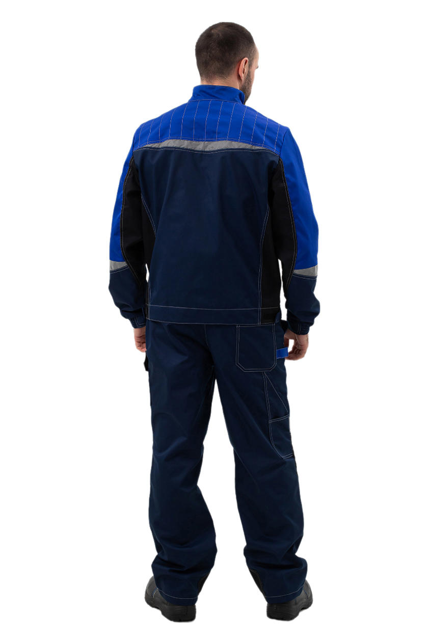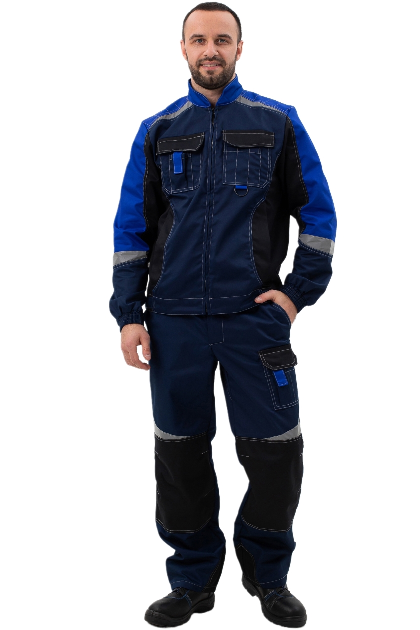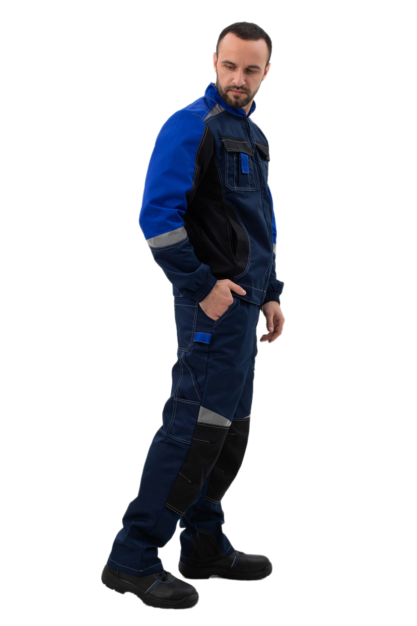 ➠ Куртка: силуэт прямой, пояс притачной, застежка на молнию, воротник стойка. Накладные карманы комбинированные с малыми накладными карманами с разделителями. Прорезные карманы на нижней части полочки. По шву притачивания кокетки вверху и по рукавам фигурные вставки СОП.➠ Брюки: на притачном поясе, гульфик с застежкой на «молнию», боковые карманы с отрезным бочком. Колени усилены накладками, заложены по 2 вытачки. Один карман над левым наколенником. По шву наколенников косые, фигурные вставки СОП.