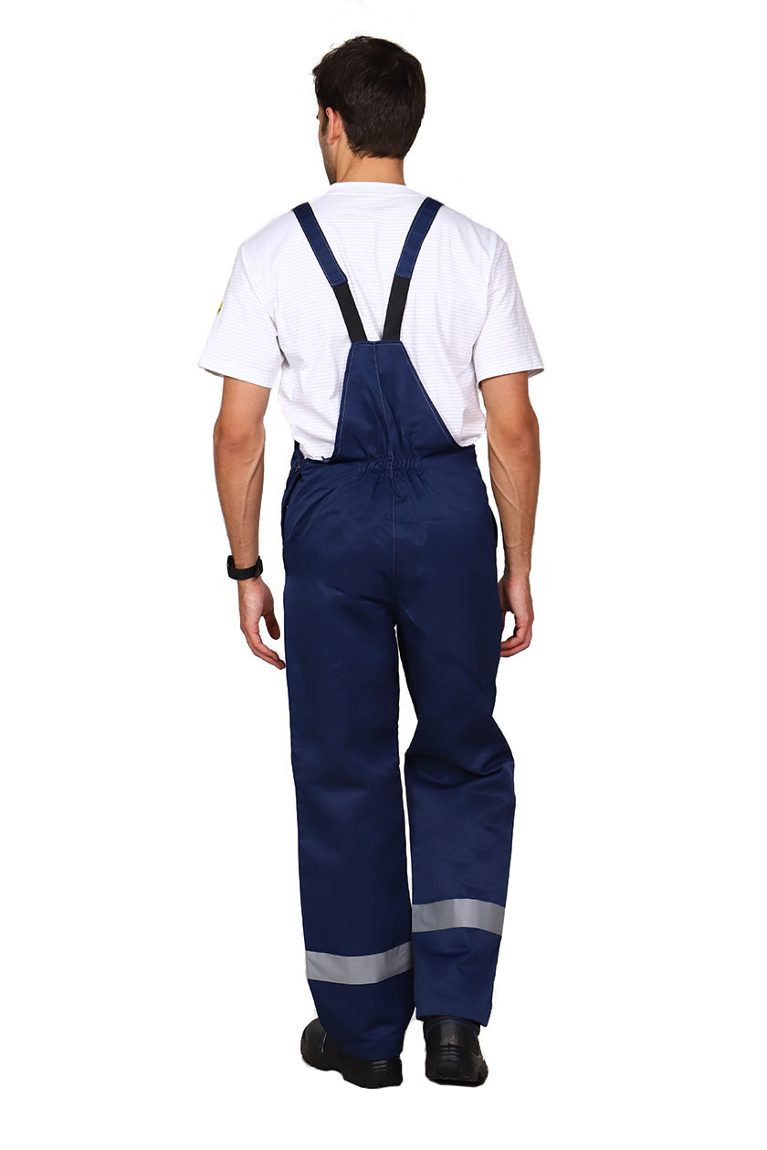 ➠ Полукомбинезон: с застежкой гульфика на тесьму «молния» и застежкой в правом боковом шве на пуговицы. Два накладных кармана с наклонным входом. В области коленей усилительные накладки. На правой задней половинке накладной карман. На грудке накладной карман с клапаном. По низу брюк СОП 50 мм.