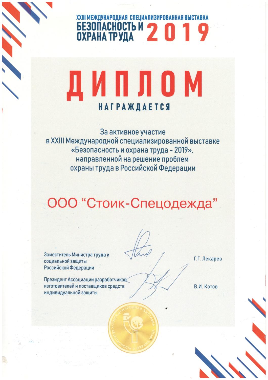 Диплом за активное участие в 23-й в международной специализированной выставке "Безопасность и охрана труда 2019".